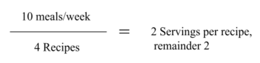 The remainder here is where you decide which recipe you’d like to have more servings of. If you make 2 servings of 4 of the meals, you would have 8 and just need 2 more to finish your week. Add a serving to two of the meals, make another recipe, or add two servings to one of the meals. Here's what your week could look like: