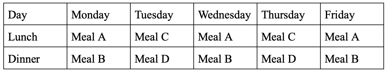 So let’s say you want to prepare lunch and dinner for Monday-Friday. This would be 10 meals. Say you don't want to eat the same meal twice in two days. You’d need 4 unique meals to prevent having the same thing two days in a row.